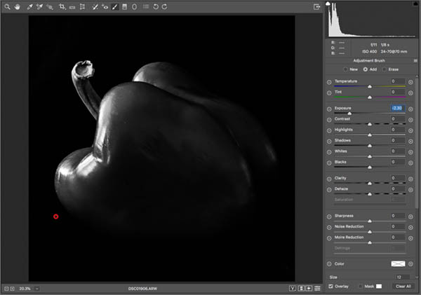 Darken large areas with the adjustment brushes using Exposure or Blacks